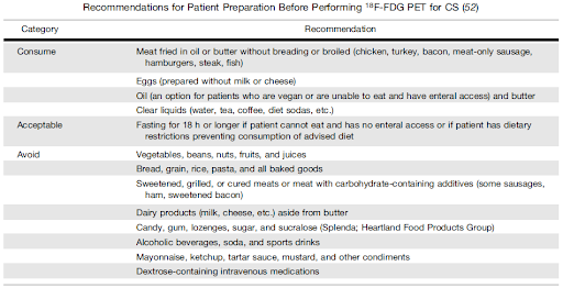 - Details: A high-fat, high-protein, very-low carbohydrate diet should be followed for ideally 3 days prior to the study followed by a prolonged period of not eating before the scan, for at least 12 hours but preferably 18 hours.